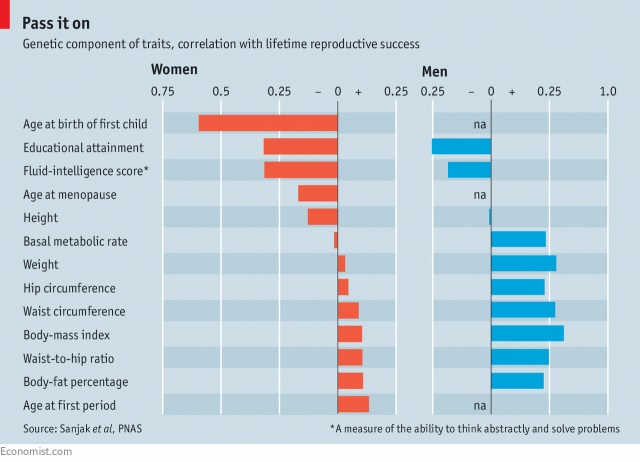Segundo um estudo citado pela Economist, baseado em dados do UK Biobank referentes a meio milhão de pessoas, a correlação entre os componentes genéticos de certos atributos humanos e o número de descendentes de cada pessoa (factor designado como «lifetime reproductive success») deu os seguintes valores (os valores positivos significam uma relação no mesmo sentido - por exemplo, mais descendentes<->maior índice de massa corporal; valores negativos significam o contrário - por exemplo, mais descendentes<->menor nível educacional):